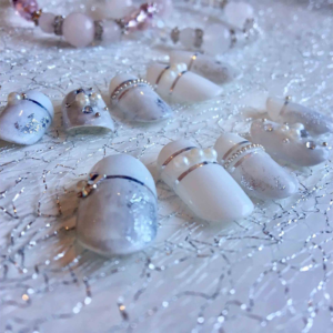 光り輝く宝石のような純白のドレスにマッチする指先♪ウエディンググローブを外した瞬間、気分が高まるような美しいネイルアート。華奢で透き通るようなまつエクも、花嫁にふさわしい愛らしさです(^^♪